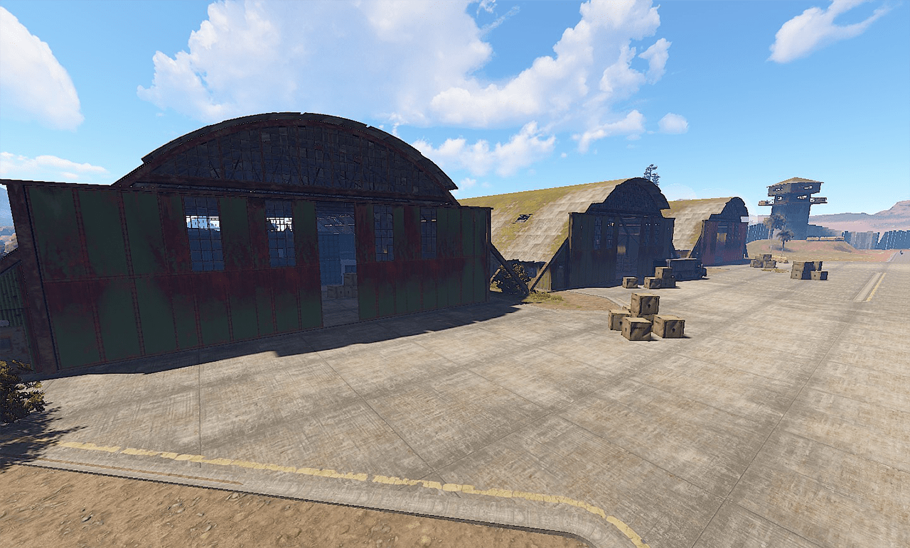 The airfield monument within rust contains multiple hangers, watchtowers, and a central office building filled with loot, utilities, and the start of the.